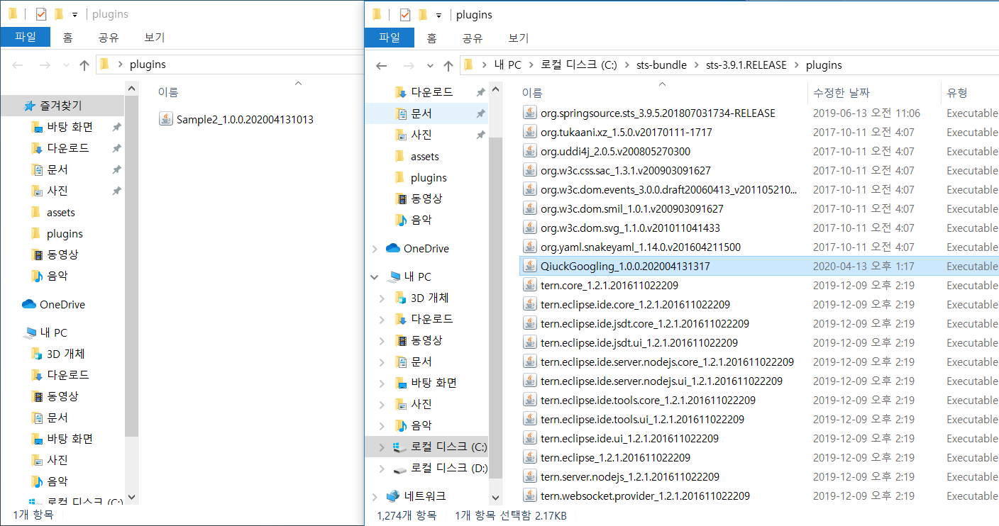 Destinatin Directory에 export된 jar파일을 sts plugin폴더에 등록