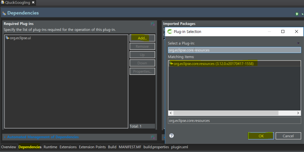 Dependencies > Add... > 'org.eclipse.core.resources' 검색 후 선택 > ok