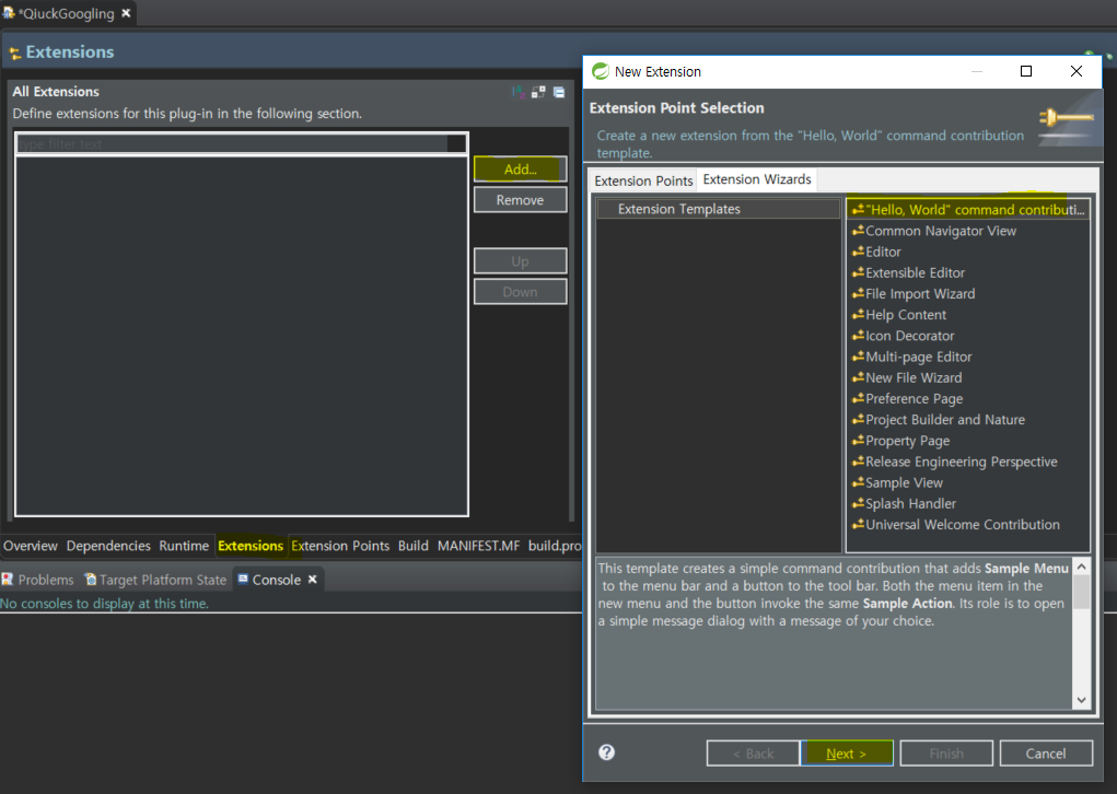 Extensions > Add.. > Extension Wizards > "Hello..... 선택 next